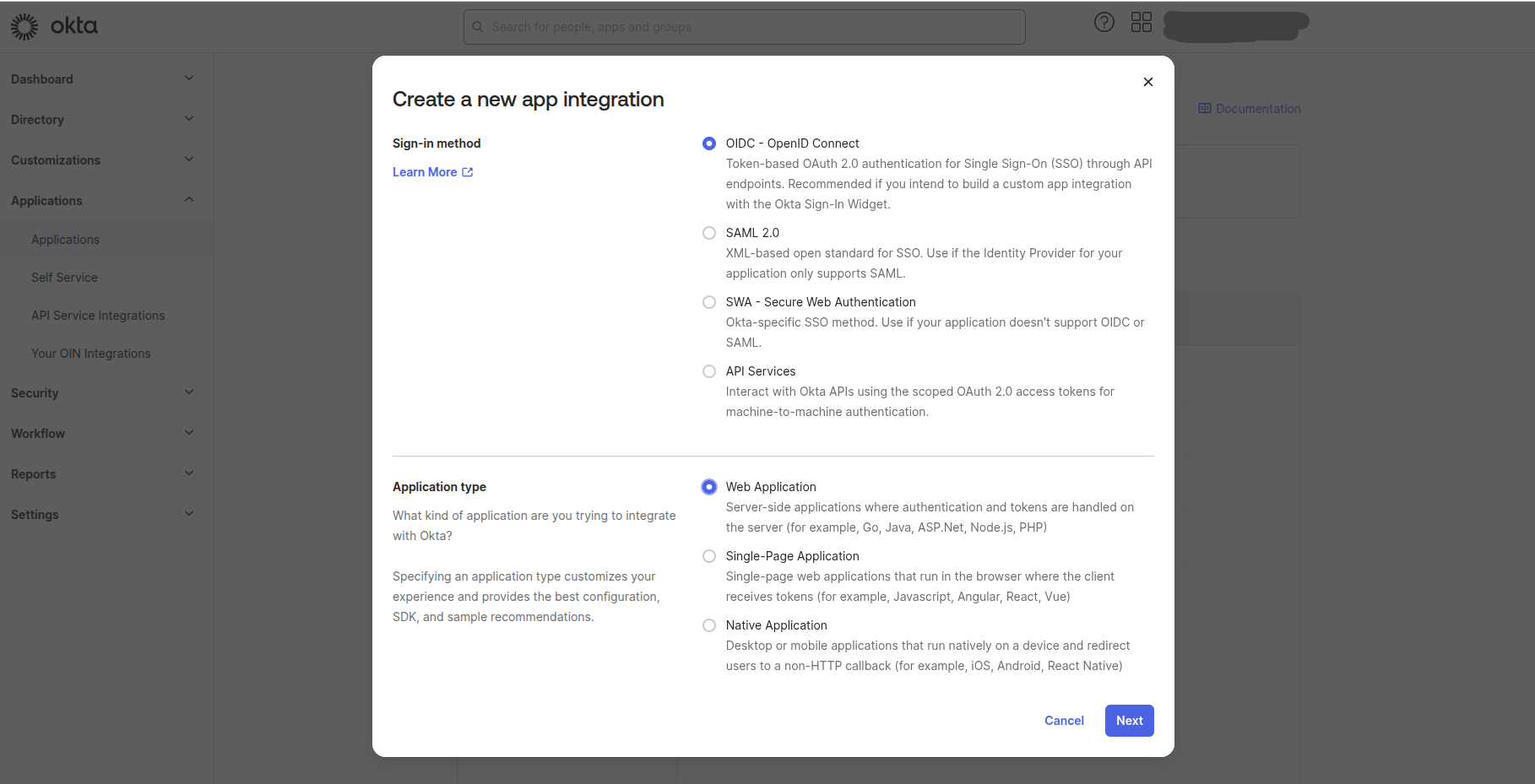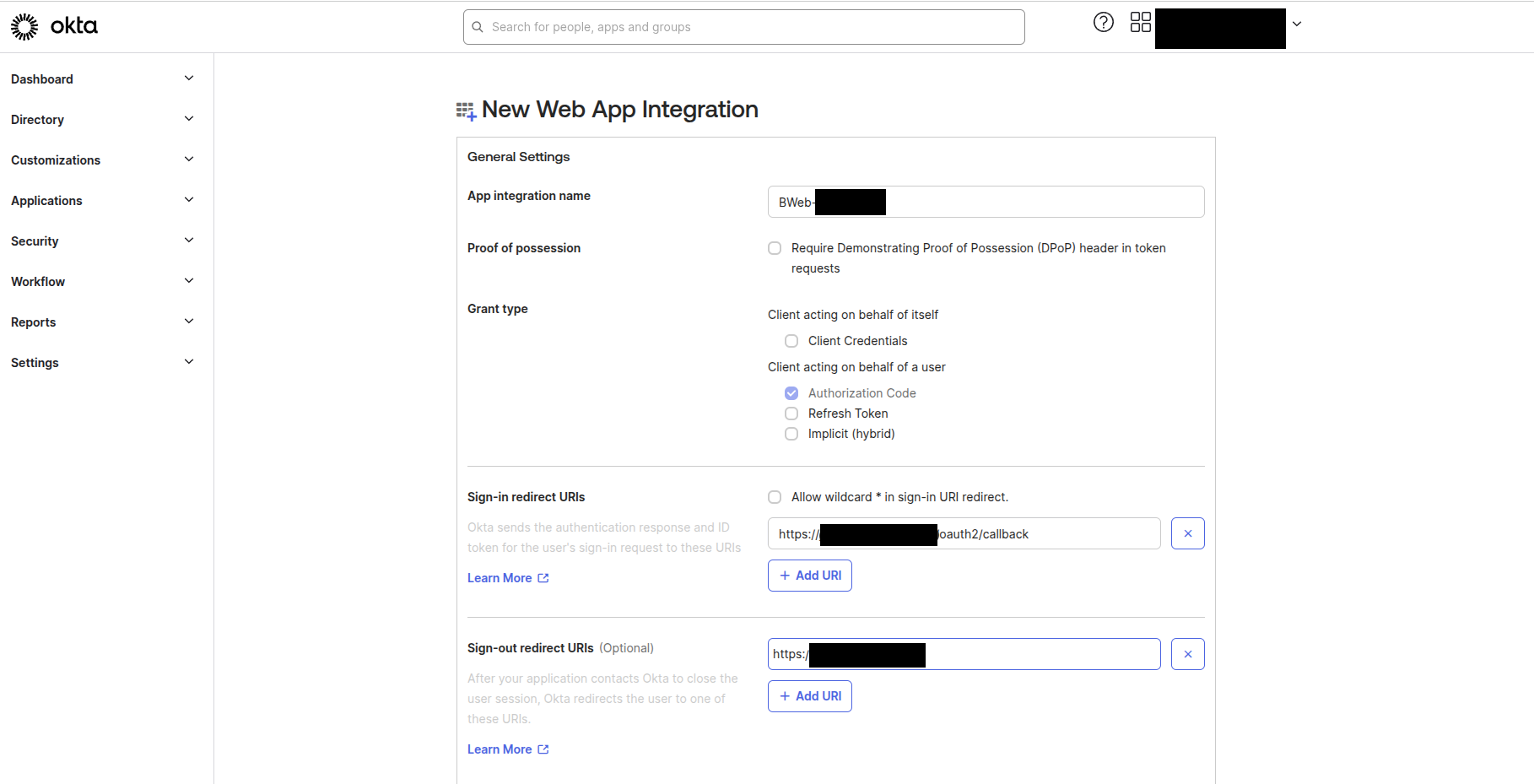 The first step is to create an application in Okta that represents BWeb.